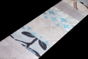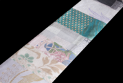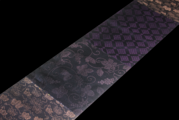 試作でおった帯の生地を切り取り様々な模様のものをつなげ合わせひとつの作品にしたものです。