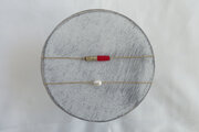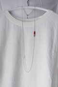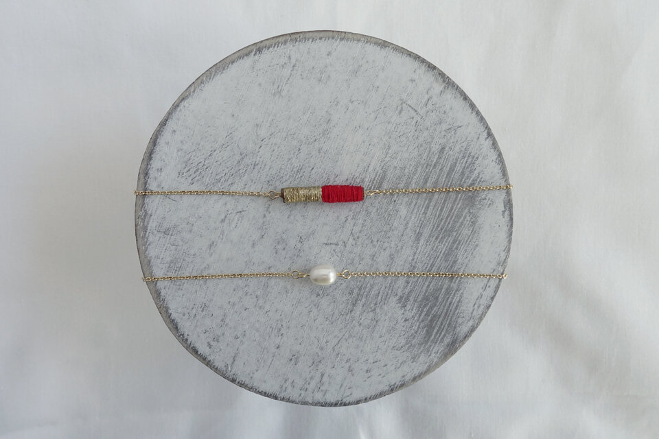 長めのネックレスとして仕上げたこの作品はゴールドと赤の糸で華やかな印象にしつつ、淡水パールで落ち着きのある大人な印象の1点に仕上げました。