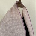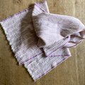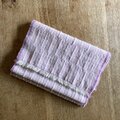 マフラーの端にグレープピンクのラインが入り、全体はピンクと白の糸を交互に織り込み薄ピンクのような色彩です。房部分は短めのポサポサとした自然な感じです。素材の特性を生かして、ポコポコとした凹凸感のある風合いに仕上げました。
