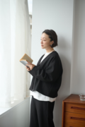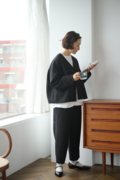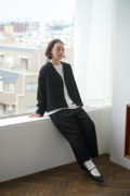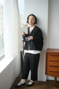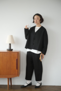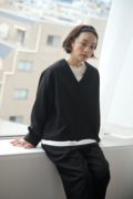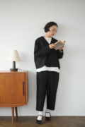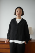 ・顔周りをすっきりと見せるVネック&ノーカラーは適度なインナー見せを叶える