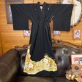 【黒留袖 着物 リメイク ロングワンピース ドレス 洗える 化繊 二/2部式お太鼓 袋帯ハンドメイド レトロ 古着 和洋折衷 金の花々と飛翔する鳳凰が、まるで絵巻物のように華やか TKW-64 】