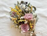 自宅でドライフラワーにしたミモザとラナンキュラスをポイントに