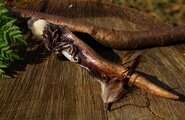 神秘的なスモーキークォーツのポイントに、アンモナイトのスライス、イミテーションのバードスカルを、アクリル樹脂粘土のフィモでアントラー(鹿の角)に固定しました。さらに、フェザーをアンティークゴールドのチェーンとワイヤーで留めつけました。