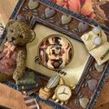 遊び心とエレガンスが融合した、唯一無二の帯留め。金色の縁取りが施されたガラスカボションの中には、スチームパンクのアイテムを纏った