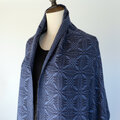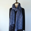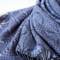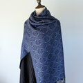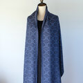 ブラックに近いミッドナイトブルーをたて糸に、ミドルトーンのブルーグレー(薄群青色)をよこ糸に、細やかで複雑な柄を織り出しました。たて糸とよこ糸の色相に差があるので光沢感のある紋様がはっきりと浮かび上がり、落ち着いた色合いながら華やかさのあるストールです。表と裏で織柄と色の出方が反転するので、纏い方でいろいろな表情を楽しめます。春や秋は広げてアウターの代わりに、冬は首元に小さく巻いてマフラーのように、また、上品な光沢があるのでフォーマルな場にもお使いいただけます。光源によって青味や紫味が増す綺麗な色合いで、シンプルで上品な大人コーデのポイントにお勧めのストールです。