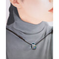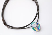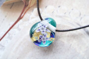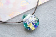 金箔を貼り付けた水色×青の地に、苧環を咲かせた小さなペンダントです。