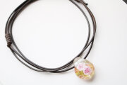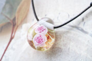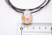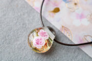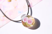金箔を貼り付けたピンク×黄緑の地に、薔薇を咲かせた小さなペンダントです。