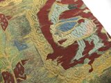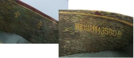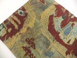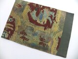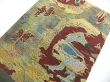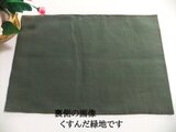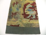 ■新品の帯をリメイクしました。くすんだ緑地に原始時代の動物が描かれた珍しい文様です。原始人が画かれていましたがこちらには足部分しかありませんのでお安くしました。特許番号が織られているので高価だっと思われます。(その部分はこちらの商品には含まれません)高級帯に使用する技法「膨れ織」で立体感があります。端は帯中無地部分です。