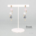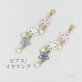 花チャームを縦に互い違いにつなげ、パールをあしらうことで動きのある「じゃらじゃら感」を演出しました。