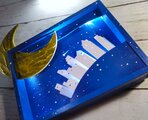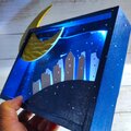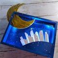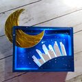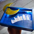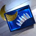 内部にLEDを装着していますので、摩天楼、流れ星、三日月がそれぞれ灯りで浮かび上がるように工夫をしています。