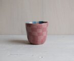 ピンクや青の濃淡のある土が景色を作る練り上げ技法のカップ。
