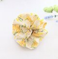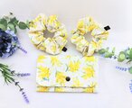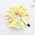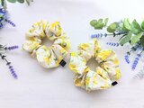 オフホワイト地に可愛い青い小鳥とミモザの花柄、明るく可愛いシュシュです。