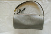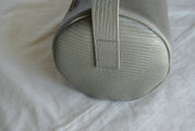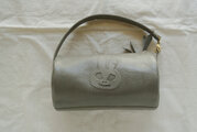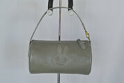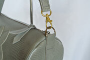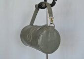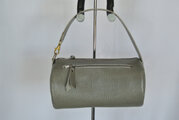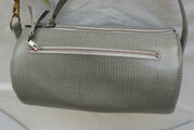 渋いグレーのリザードの型押しの革で作った丸い筒型のショルダーバックです。