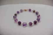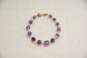 ライラックの花房を思わせるような色や濃淡の異なる紫色の石を集めたブレスレットです。白い母岩やクォーツが所どころに混ざりあったアメジストや、ややピンクに近いフローライト、鮮やかな赤紫がひときわ目を引くレピドライトなどムラサキがてんこ盛りになっています。