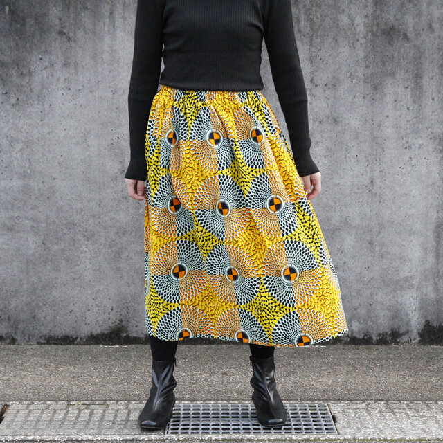 【受注制作】アフリカ布のギャザースカート( イエローサークル )アフリカンプリント アフリカンファブリック