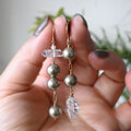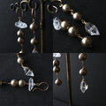 こちらはラフな印象のクリスタルにシックな色合いの貝パールをあわせたアシンメトリーデザインのピアス。カットの美しい小さなオパールや14kgfのスクウェアチェーンをポイントに加え、個性的なデザインに仕上げました。