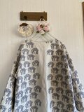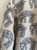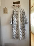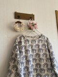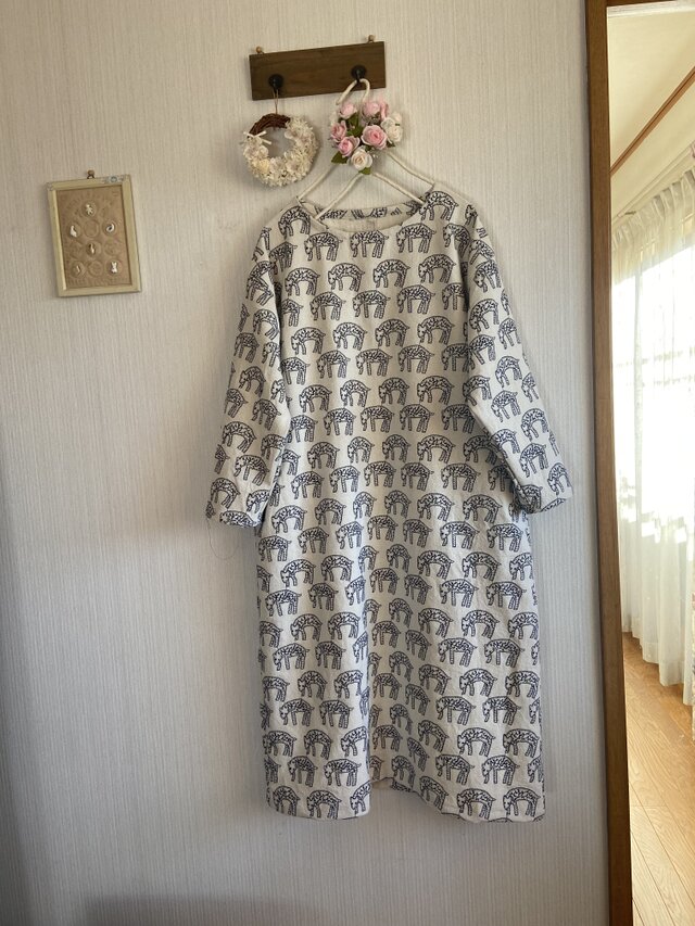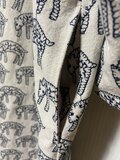 ・生成り地に紺の羊の刺繍柄が可愛い生地です。お袖は七、八分丈ぐらいで、サイドポケット付きです。