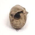 中央部に穴を開けて、内径1.6cm、高さ8cm のガラス管を挿入、上部に吊り金具を取り付け、吊り式の花器として仕上げました。