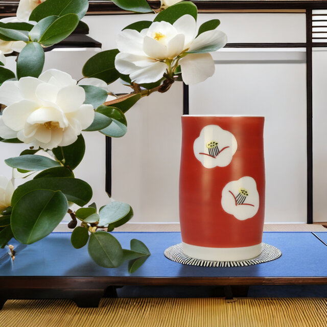 心を和ませる温かいお茶のお供、「手描き赤巻椿 長湯呑【美濃焼】」は、職人の手によって一つひとつ丁寧に描かれた椿模様が特徴的な逸品です。赤を基調にした上品なデザインは、食卓に華を添え、訪れる方々を魅了することでしょう。