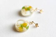 グリーン、イエロー、ホワイトのお花をぎゅっと詰め込んだブーケのような華やかなピアス。