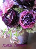 アンティークなパープルの陶器の花器に同系色のラナンキュラスをたっぷり使ってアレンジしました。