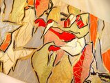 ■帯として使用感があり柄が混んでいるので目立ちませんが薄シミが数か所あります。裏側は使用に問題ございませんが薄シミありです。モダンな色合いで群鶴や模様が黒糸・金糸で縁取られ華やかで芸術的な文様です。