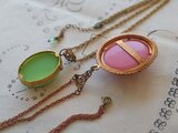 ピンク色Glassが台座との相性が良く、真鍮古美色よりも柔らかい雰囲気のやさしいお色です。チェーンの途中でカンを挟んでちょっとした切り替え、アクセントを施しました。