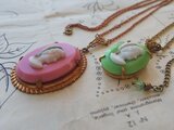 ヴィンテージ ピンク色Glassカメオ(40×30㎜)/Green&Goldリボン ネックレス