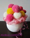 白いキャンディボックスのような花器にピンクのシュシュをまいて