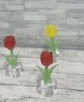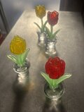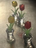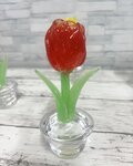 ガラスで作った赤色のチューリップの鉢植えです。