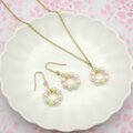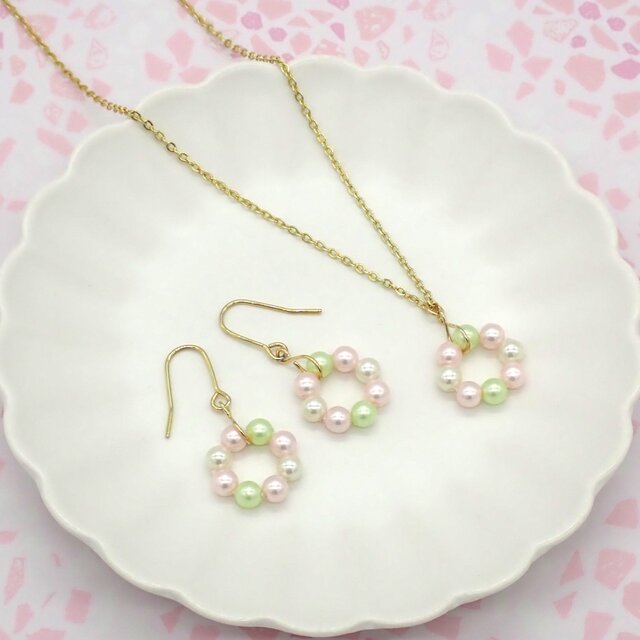 さくら色のサークルパールの大人可愛いネックレスとピアス/イヤリングのセットです。