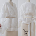 カシュクール側をバックにする時は、先に前側でウエストリボンを結んでから後側に回して袖を通すと、簡単に着られます