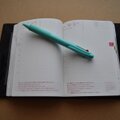 ペンを挿すことで手帳を開かないように固定できます。また、簡単なメモを挟めるメモ差しも付属。
