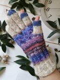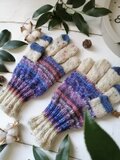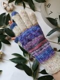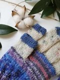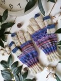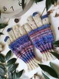 青い鳥の羽根のような色合いの、手編みのスマホ操作対応の5本指手袋です。