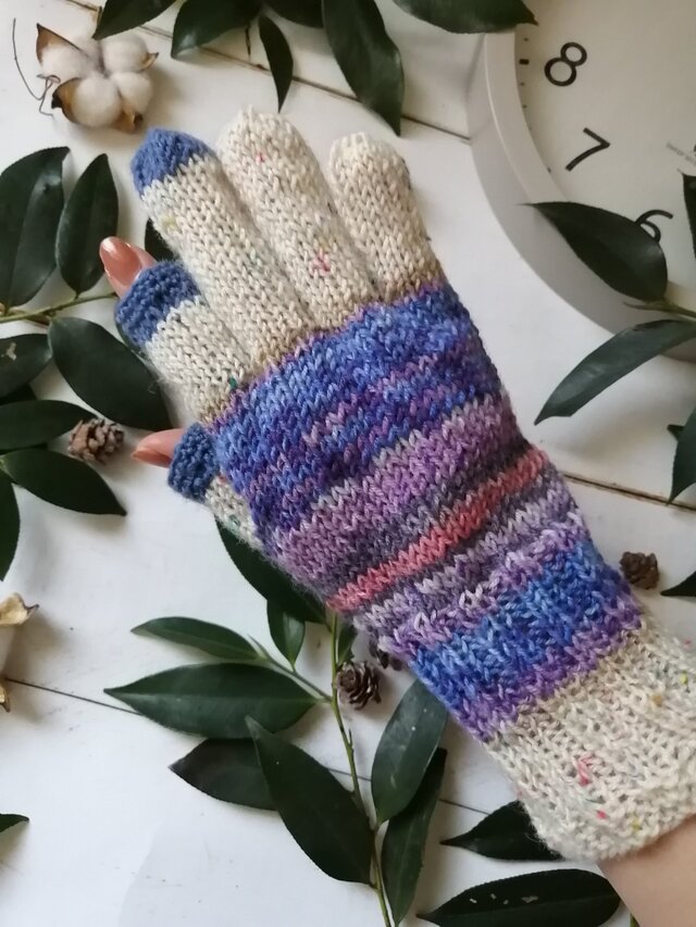 両手の親指と人さし指を短く編んであるので、外さずにスマホ操作もでき、カバンからお財布や手帳をとりだすのにもスムーズです。