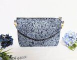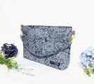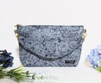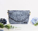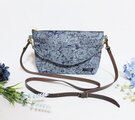 ネイビー地にブルーグレー色の薔薇の花柄、薄くて軽い綿シーチング地にバック用接着芯を貼っています。