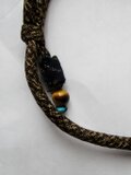 正絹の泥大島紬の着物で作ったループを付け、片側のループの先端に虎目石の玉とトルコ石を付けています。