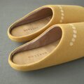 かかと覆いがないので、脱ぎ履きしやすく脱げにくいカタチ。左右があって足にフィット。つま先が少し上がった、つまずきにくい形です。