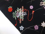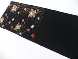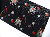 ■帯として使用がなかったような美品です。黒地に笛や小花文様です。黒い帯は数が少ないので貴重です。絹の光沢も美しく高級感がある帯地です。