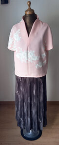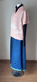 優しいサーモンピンクの地色にお花の柄の付下げの着物でした。洗濯機で水洗いしてから作っています。汚れ、シミはありません。