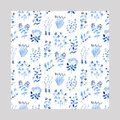 ムスカリ、ビオラ、ビバーナム、ローズマリー、アカツメグサ、カレープラント、アマドコロなどの草花を青い水彩絵の具で描きました。