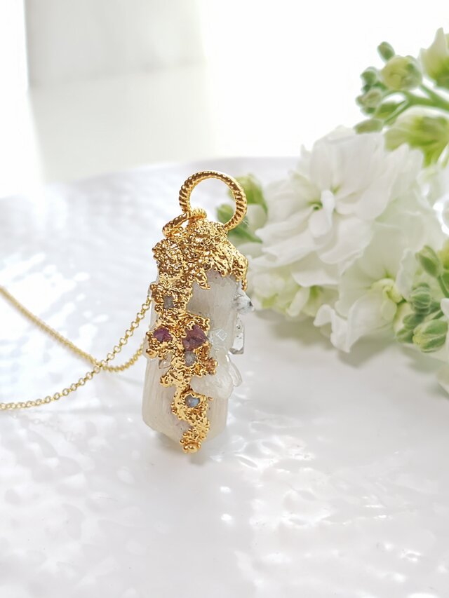 アポフィライトの両面に、それぞれピンクとグリーンのトルマリンをデザインしました。