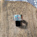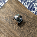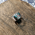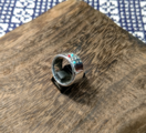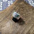 シルバー950製。幅10mmの平打ちリングに英字の点字配列でAとI「a·i」と読む位置にトルコ石と珊瑚をセットしました。触れて感じることの出来る触覚リングです。サイズは11.5号。尚、これは他でも販売していますので重ならないように購入前に質問から必ず在庫確認お願いします。