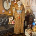 【着物 リメイク ロング ワンピース ドレス 洗える 化繊 名古屋帯サッシュベルト 和洋折衷 レトロ 古着 ハンドメイド 温かみのあるアンティークゴールドを基調とし、幾何学的な文様が織りなす繊細な世界。 KW-873】