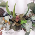色々な種類のユーカリや、ペパーミント、フィットニアなどのグリーンを三日月型の土台に付けましたアーティフィシャルフラワーのリースです。