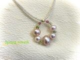 春らしい色目のパールと優しい草色のクリソベリル。リースのように円形に仕立てた可愛らしいフォルムのネックレスが出来上がりました。小粒の白色淡水真珠と合わせ、やわらかいイメージですが存在感もある一品ですね。