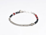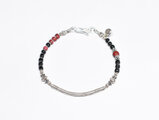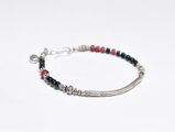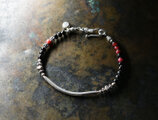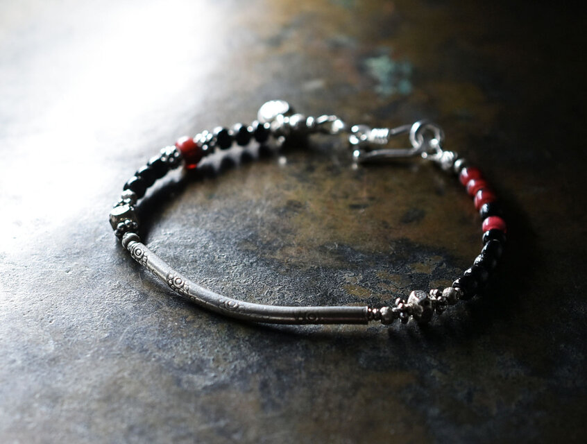 湾曲カレンシルバーと漆黒ビーズ、金赤ホワイトハーツを繋いだ華奢なブレスです。