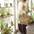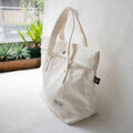 ミリタリーのヘルメットバッグに着想を得たバッグです。持ち手はジーンズ用のリベットで補強。ウォッシャブルの丈夫な手提げカバンで、ペットボトルは立てたまま入り、A4サイズもピッタリ入る使い勝手のいい形です。