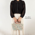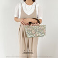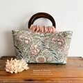 ⭐️スペイン製のウィリアムモリスのインポート生地を使用。つなぎ目はおしゃれなシャーリングでデザインしています。アンティーク風でシャビーな木の持ち手を使用しています☆
