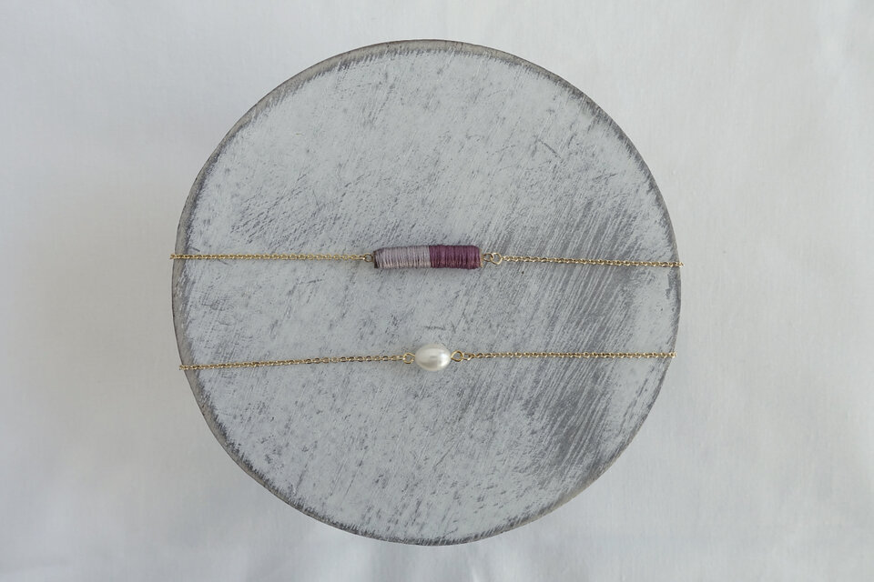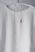 長めのネックレスとして仕上げたこの作品はピンクのラメとパープルの糸でトレンドのピンク系に。淡水パールで落ち着きのある大人な印象の1点に仕上げました。派手すぎないくすみカラーなので気軽に取り入れる作品です。